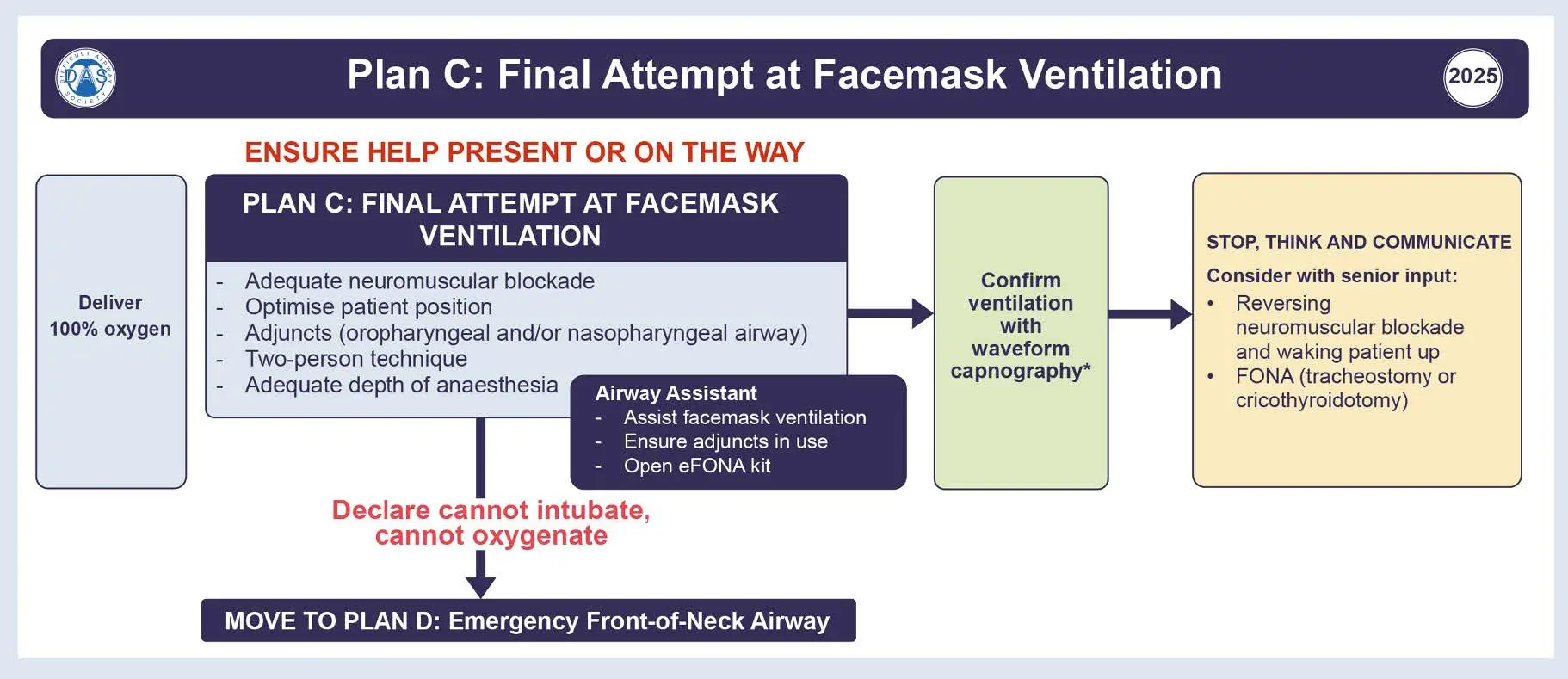 El Plan C es el último recurso para oxigenar al paciente antes de declarar un escenario de "no se puede intubar, no se puede oxigenar" (NINO). El objetivo es restablecer la ventilación antes de proceder a una vía aérea quirúrgica de emergencia.