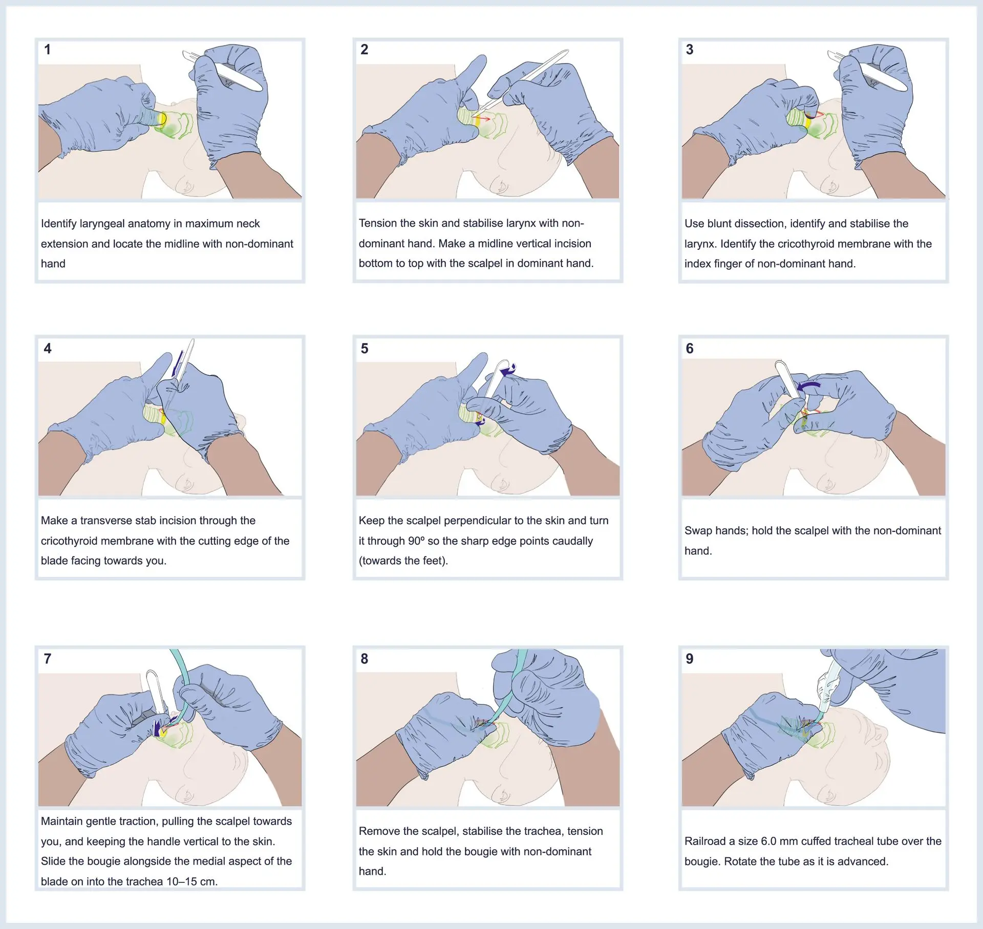 La técnica de "bisturí-bougie-tubo" se mantiene como el método de elección. El equipo esencial consta de tres elementos: un bisturí del número 10, un introductor (bougie) y un tubo traqueal con balón de tamaño 6.0 mm.