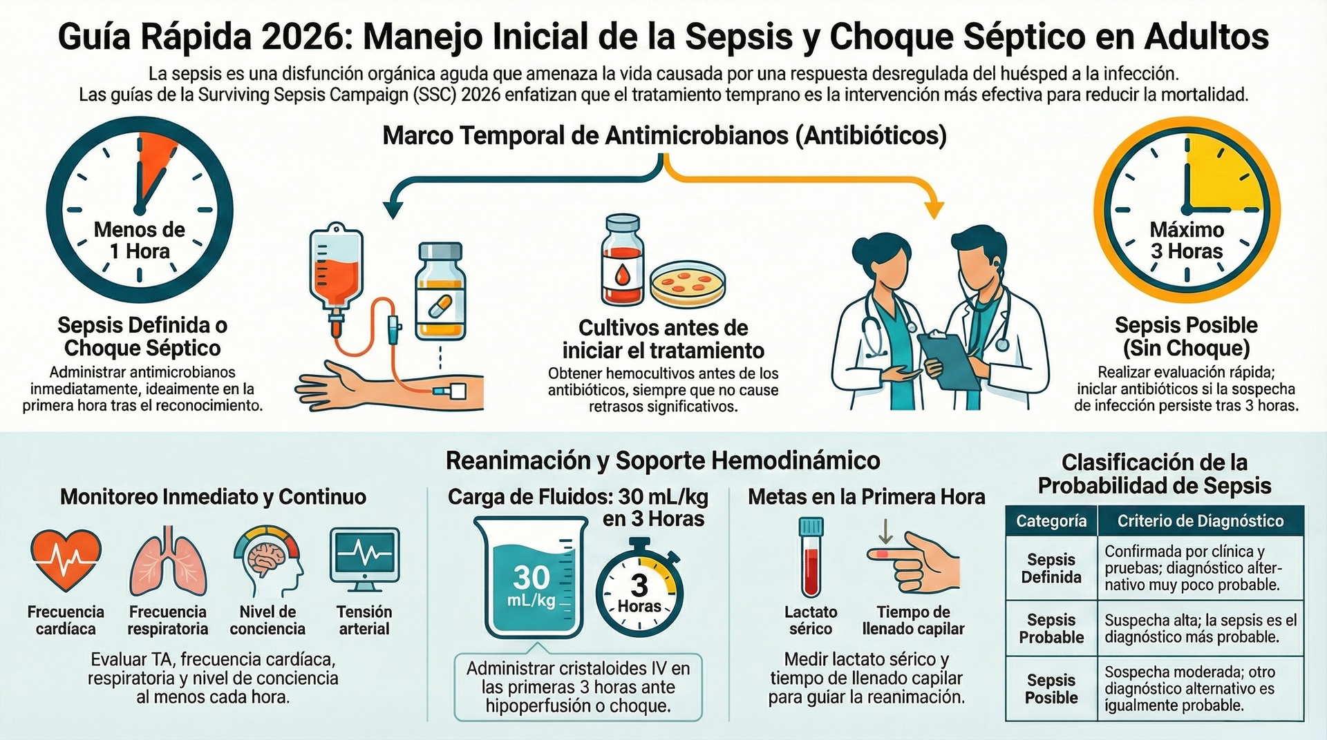 En la sepsis, el tiempo es tejido. No obstante, la Guía 2026 introduce una finura diagnóstica esencial para evitar el sobretratamiento y la resistencia antimicrobiana, categorizando la urgencia según la probabilidad diagnóstica (basada en la Tabla 3 de la fuente):